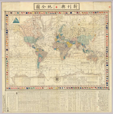 Mounted cover title. Wood block print. In Japanese. Shows navigation routes of important explorers. Includes distance chart of sea routes from London and New York. Title on map: Shinkan yochi zenzu. Prefaces by Tobikawa Yoshikuni and Kimura Takeshi. Includes flags of foreign nations, texts on latitudes and longitudes, and legend. Engraved by Takeguchi Ryuzaburo and Kamimura Fukusaburo. Col., folded in cover 35 x 23 cm. East Asian Library call number: A12.