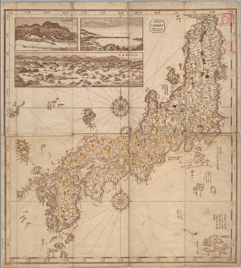 Copperplate print. In Japanese. Covers Matsumae to Tsushima, Okinoerabujima and Ogasawara. Includes 3 insets: Tanshu Amano Hashidate fukei -- Geishu Itsukushima fukei -- Oshu Matsushima fukei. Shows the distance of sea routes. Includes longitude and latitude and explanation of Kuroshio. Includes compass rose. Folded to 29 x 9 cm., in envelope 23 x 16 cm. East Asian Library call number Ca44.