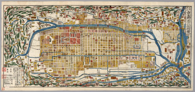 Japanese date Genji 1 [1864]. In color. Folded. Cover title. Wood block print. Oriented with north to the left. In Japanese. Relief shown pictorially. Title on map: Genji kaisei Miyako meisho michi no shiori no zu. Includes text on points of interest on verso by Sō Yōshi and Ryū Sōshi and legend. Drawn by Kurokawa Gyokusui.
