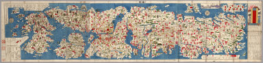 Japanese date Meiji 13 [1880]. In color. Folded. Mounted cover title. Copperplate print. In Japanese. Orientation varies. Relief shown pictorially. Includes 2 insets, distance chart and legend.