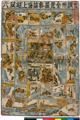 1 folded sheet : col. ill. ; 42 x 29 cm., folded to 22 x 15 cm. Illustration of Konpira pligrimages in the Edo peiod; in form of a sugoroku game board. Actual size: 42 x 28.5 cm.