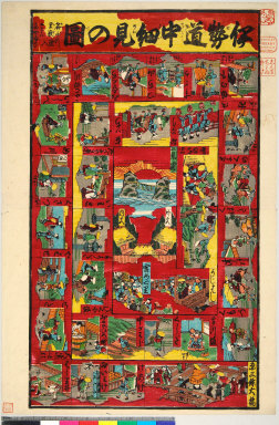 1 folded sheet : col. ill. ; 48 x 32 cm., folded to 24 x 17 cm. Illustration of Ise pligrimages in the Edo period; in form of a sugoroku game board.